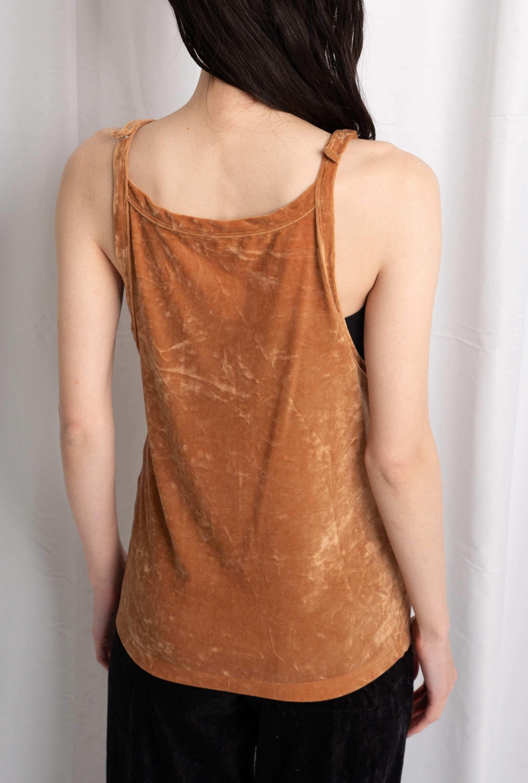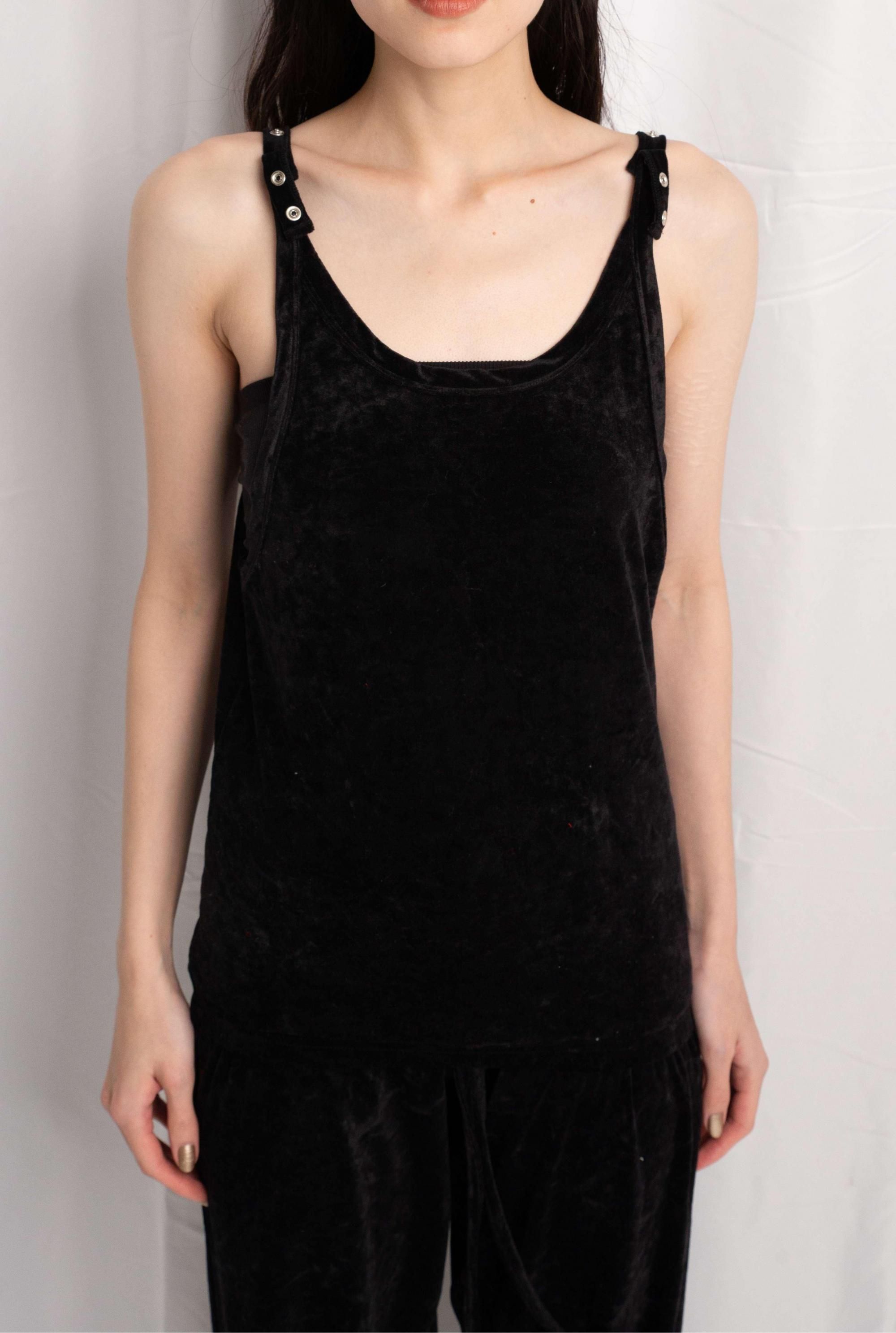 肌触りの良さと落ち感のクラッシュ表現のテクスチャーが特徴のベロア。ストレッチ性もあり、程よいドレープの良さが大人感を演出します。裾にもゴムをいれアップサイドダウンでビスチェの様にも着こなしを楽しめるキャミソールです。肩紐の長さも片側2個の釦で調整できます。