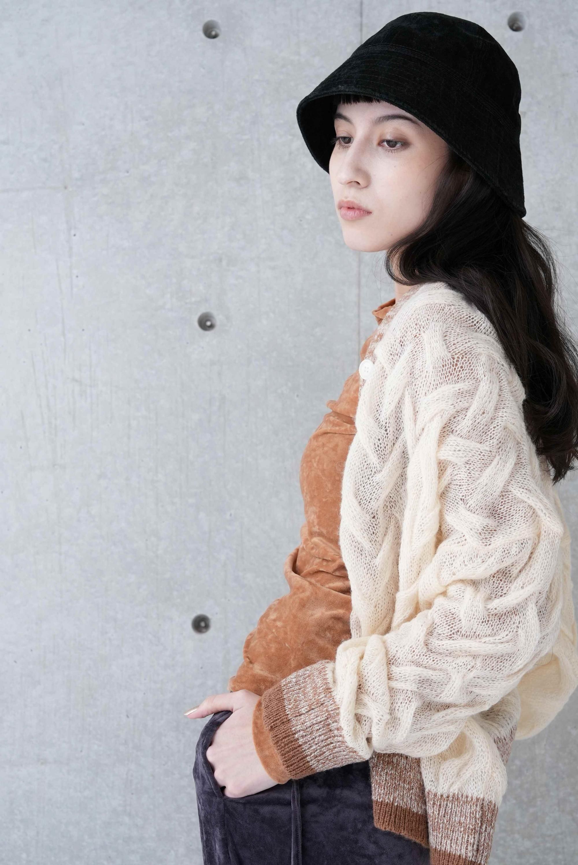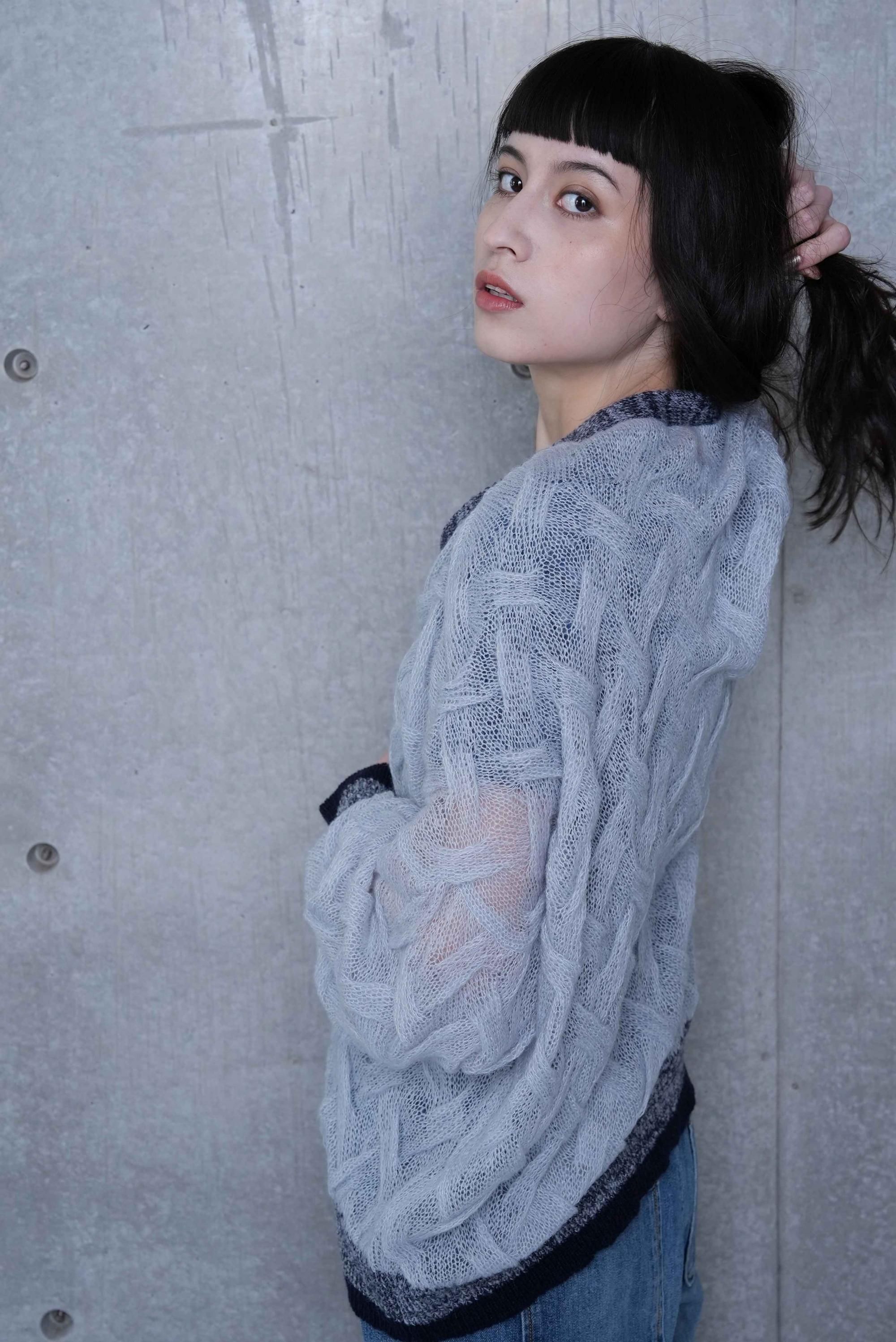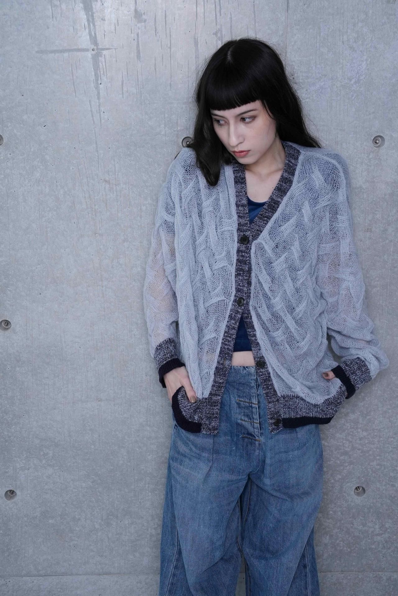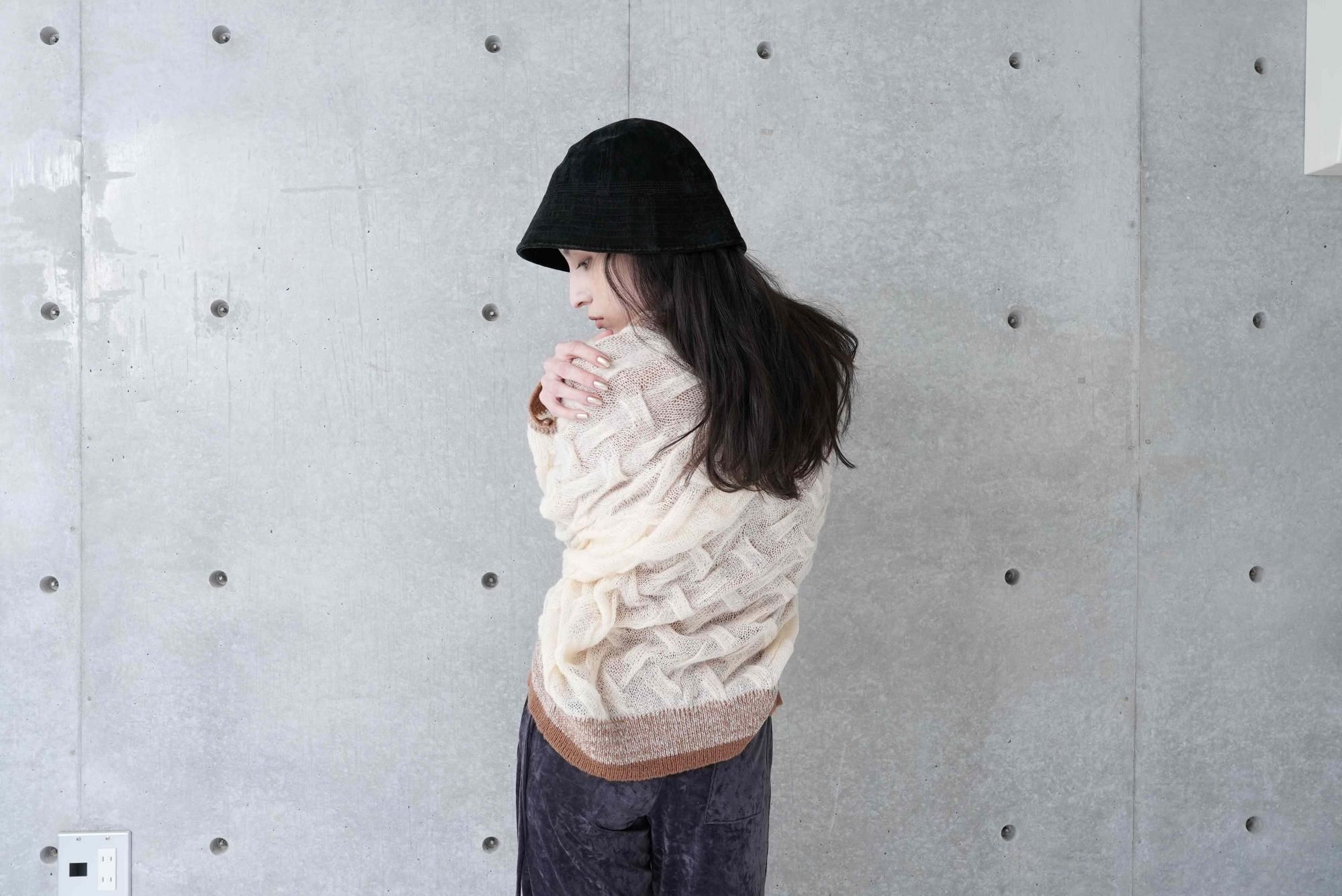 大きなケーブル調の透かし編みを表現したエアリーなモヘアニット。衿、袖口、裾のMIX配色がポイント。同素材でスーパーロングスリーブタートルのご用意もございます。