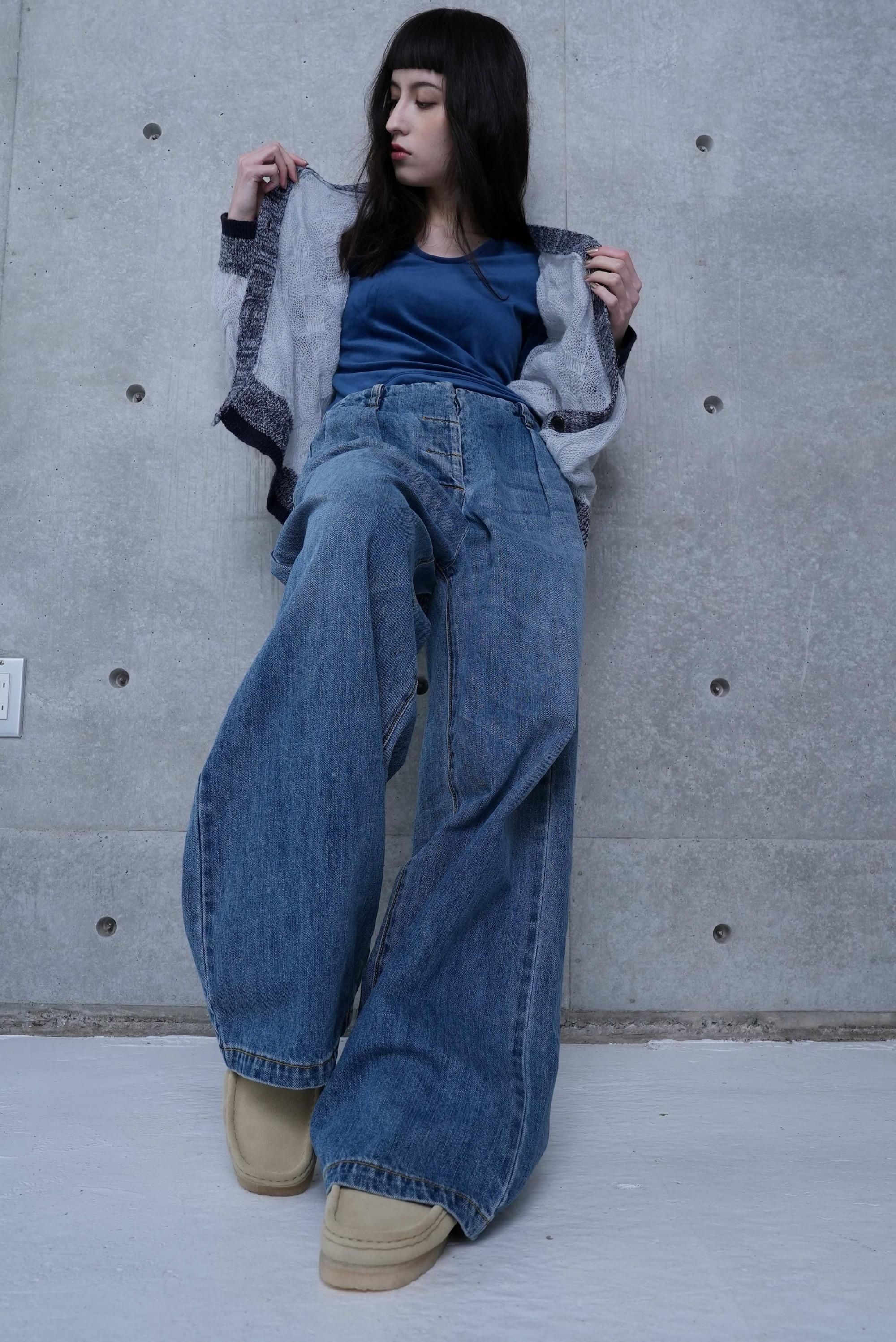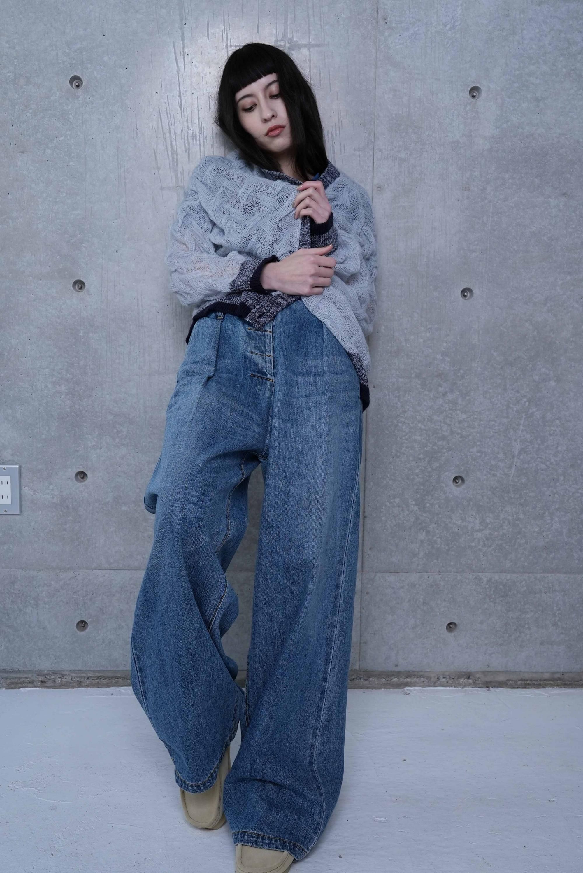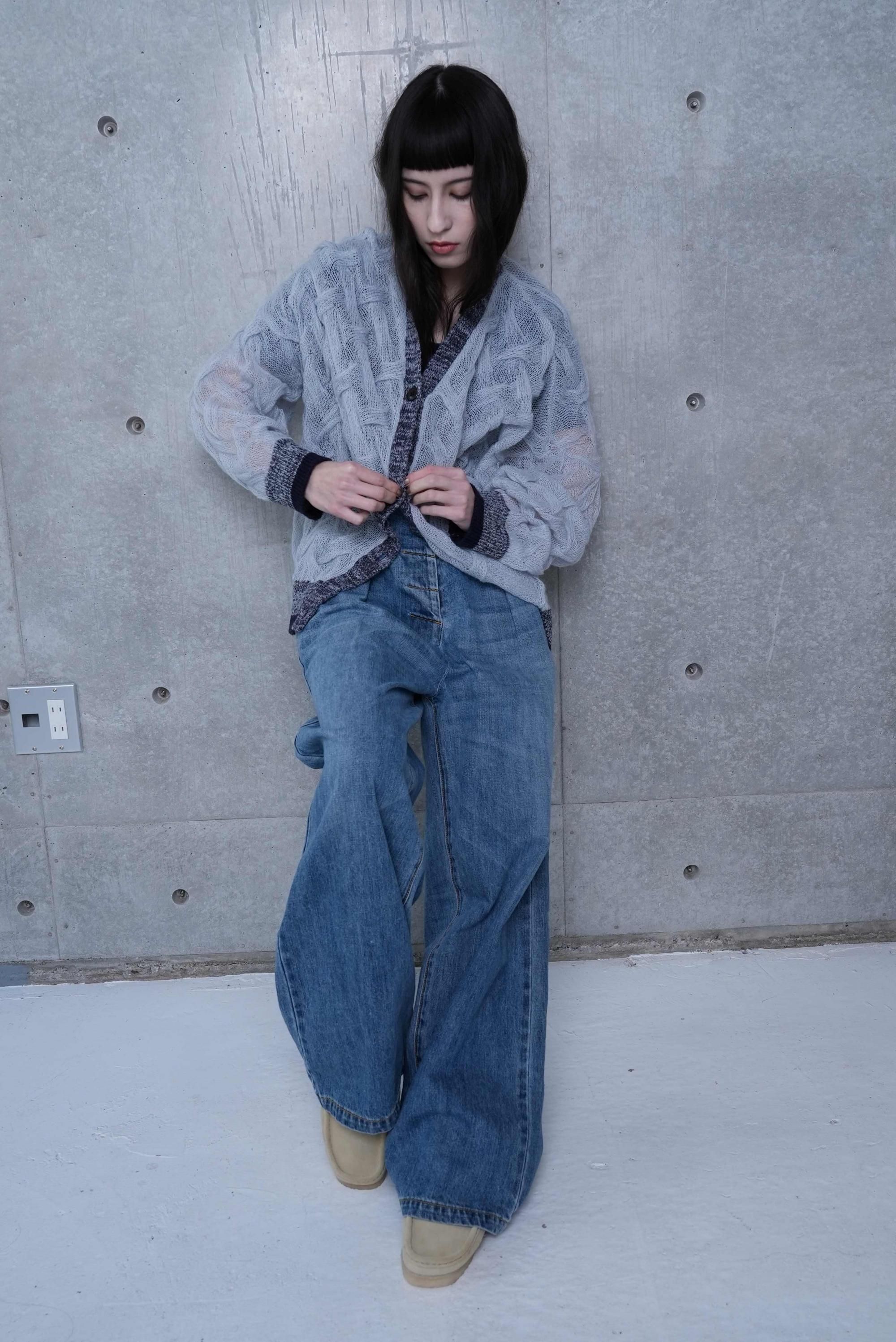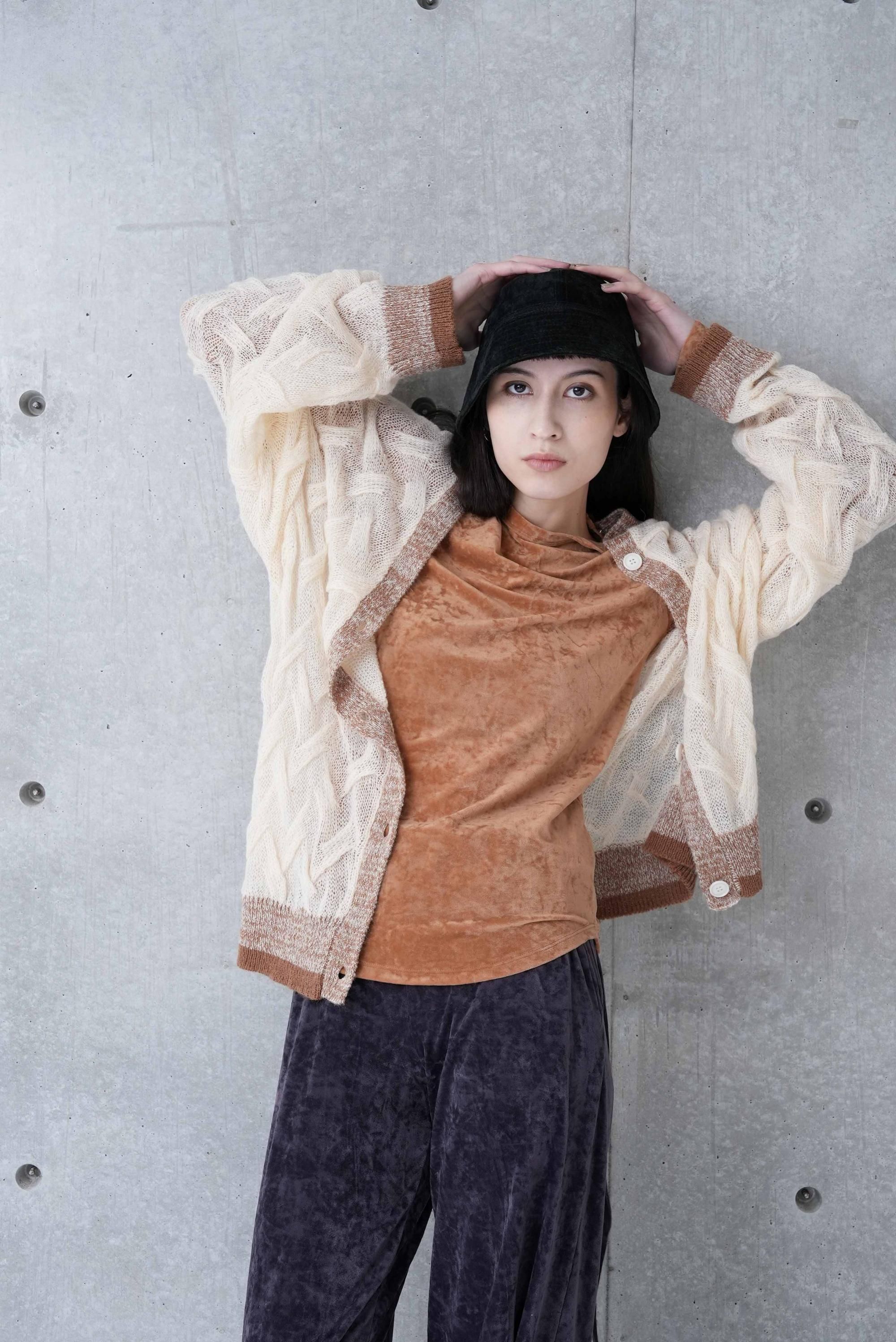 大きなケーブル調の透かし編みを表現したエアリーなモヘアニット。衿、袖口、裾のMIX配色がポイント。同素材でスーパーロングスリーブタートルのご用意もございます。